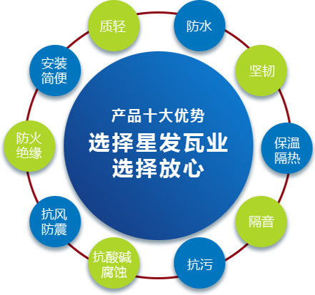 公司主要產(chǎn)品有《星發(fā)牌》合成樹脂瓦、APVC防腐耐候復(fù)合瓦、APVC發(fā)泡隔熱瓦、PVC半透明瓦、PVC防腐隔熱瓦、PVC防腐瓦、PVC防腐平板、PVC條紋板和ASA/PVC超耐候復(fù)合瓦等產(chǎn)品。產(chǎn)品一經(jīng)推出,已被廣泛應(yīng)用于國內(nèi)各類平改坡項目和大型工業(yè)項目,遠銷歐洲、亞洲、美洲和非洲等國外市場,還獲選為廣州亞運會、深圳大運會、四川災(zāi)后重建等工程項目的應(yīng)用產(chǎn)品。公司在不斷創(chuàng)新和改革的基礎(chǔ)上,力求以更好的產(chǎn)品、優(yōu)良的服務(wù),用心、專心服務(wù)好每一個客戶。